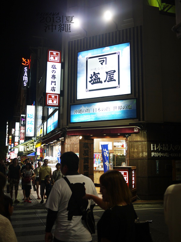 塩屋號稱全日本規模最大的鹽專賣店,店內陳列五花八門的鹽產品,但牆上有不得拍照的圖標,所以我就不敢往裡頭照了。國際通大道店就位於國際通上的某個三角窗店面,相當顯眼。可能是沖繩實在是太熱的緣故,在台灣不常吃冰的我們,一吃完暖暮拉麵,就立刻殺去塩屋嚐嚐特別的雪塩雙淇淋。