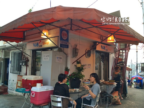 這次的首爾行,在梨花洞壁畫村爬上爬下找壁畫,早已飢腸轆轆,走到快到城廓時,眼前出現一家雜貨店,雜貨店外頭還有一個小小的、賣著煎餅的小吃部,儼然成為我們的五臟廟救星,二話不說跟阿珠瑪點來吃。