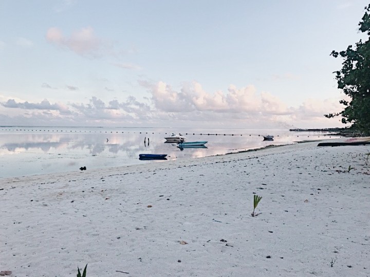 Velana Blu飯店的海灘,則是擁有一個完全讓人料想不到的美景,記得那時候只是因為要去吃晚餐,想說渡船頭那兒已經走過,就走一下其他方向,結果竟然在這裡讓我看見了久久無法忘懷的景色。接近黃昏時刻,太陽不再那麼刺眼,藍天也漸漸地變成了奶油色,清澈的海水映出那粉嫩的天,形成這幅美麗的鏡相,我記得當時吶喊了好幾次「天堂」。