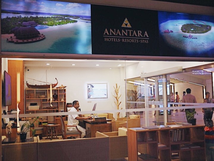 出機場後的走廊,佈滿了等待客人的馬爾地夫當地業者,有的是飯店,有的是交通船。基本上各大飯店島都會設置或大或小的櫃檯,像我們訂的Anantara就有超大的迎賓室。如果是直接從機場島要前往飯店島,來找屬於你的飯店島的櫃檯就十分方便。