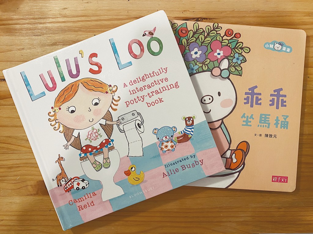 但我們到底是怎麼帶領孩子戒尿布的呢?其實我覺得繪本真的是很好的輔助工具。我們本來就有訂巧連智月刊,約莫蛋黃兩歲左右,巧連智的內容就會陸續開始提到上廁所這件事,也有附贈巧虎上馬桶的玩具,我覺得這是蛋黃對於上廁所的啟蒙,不虧是我們的虎爺啊。等到蛋黃再大一些,大概是兩歲半左右,我就陸續買了《Lulu’s Loo》 (露露上廁所)以及親子天下小豬乖乖系列的《乖乖坐馬桶》兩本書。其中蛋黃尤其喜愛Lulu’s Loo這本,應該是因為它是操作書,應該沒有不愛操作書的孩子吧。Lulu的媽媽送了Lulu一個她專屬的小馬桶、也幫她買了許多可愛的小內褲,所以我也送了蛋黃一個小馬桶(可惜不像Lulu的是桃紅色的)、也幫她買了十幾條的小內褲(不要跟我老公說),讓她可以與Lulu連結起來。而乖乖坐馬桶那一本也有提到定點上廁所的方法,所以當我定點提醒蛋黃上廁所時,她會知道乖乖也是這樣做的。這兩本我覺得都是針對戒尿布這議題而言相當適合啟蒙的書本。