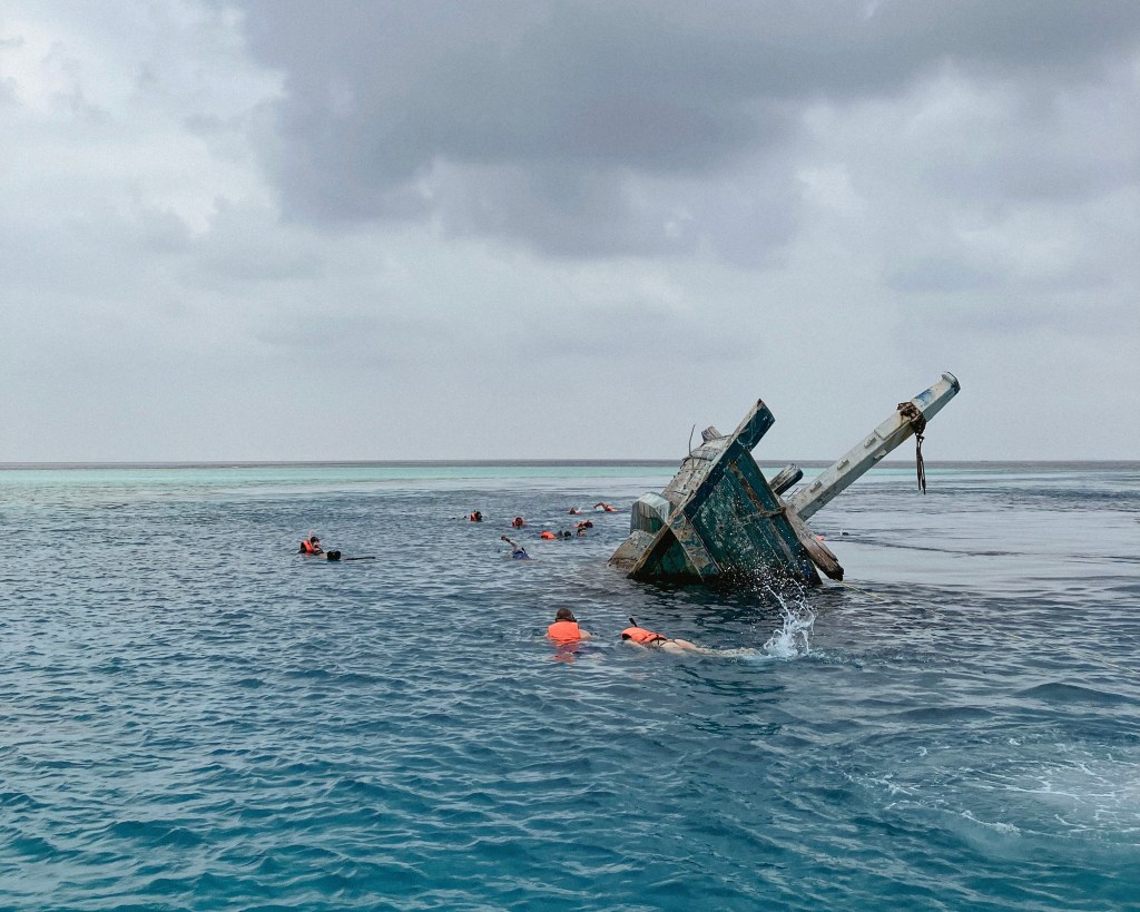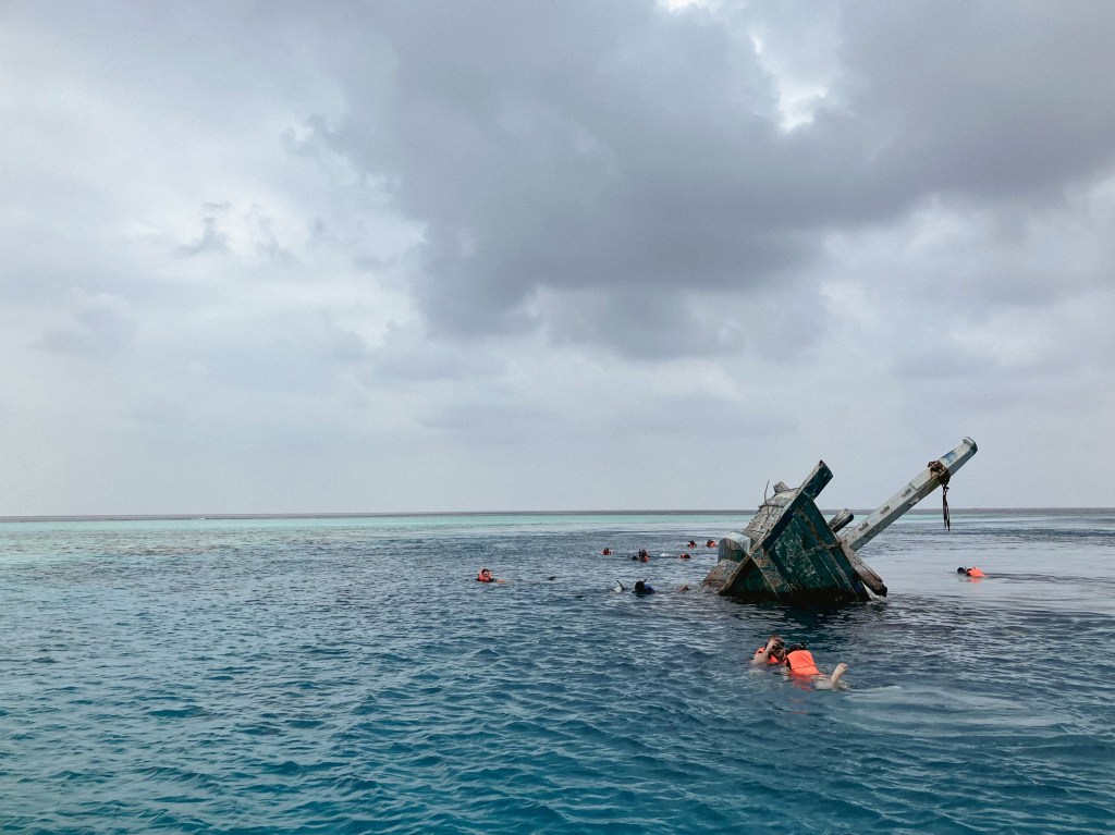 第四站是第二個浮潛點–沈船。總之它就是一條半身浸在海底的沈船,大家會覺得沈船有什麼好看嗎?其實真的還不錯耶,雖然浮潛時乍看會有點詭異,但當你靜下心來時會發現,在沈船旁邊會自成一個生態圈,船的周圍有好多的小魚在悠遊,那景象真的超級奇幻美麗的。由於上一站老公在跟護士鯊共遊時,透董吐了滿身我超級崩潰,所以這一站我毫不猶豫地跳下海來體驗浮潛。不過因為我真的太害怕了(明明我才是會游泳的那個人),所以一個人死巴在固定我們船隻與沈船間的繩索邊,照理說地陪好像也會幫遊客拍照,但我就是沒有拍到。沒關係,那美景我有記在心裡了。