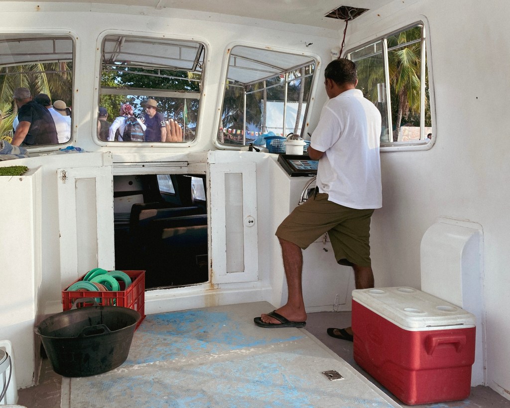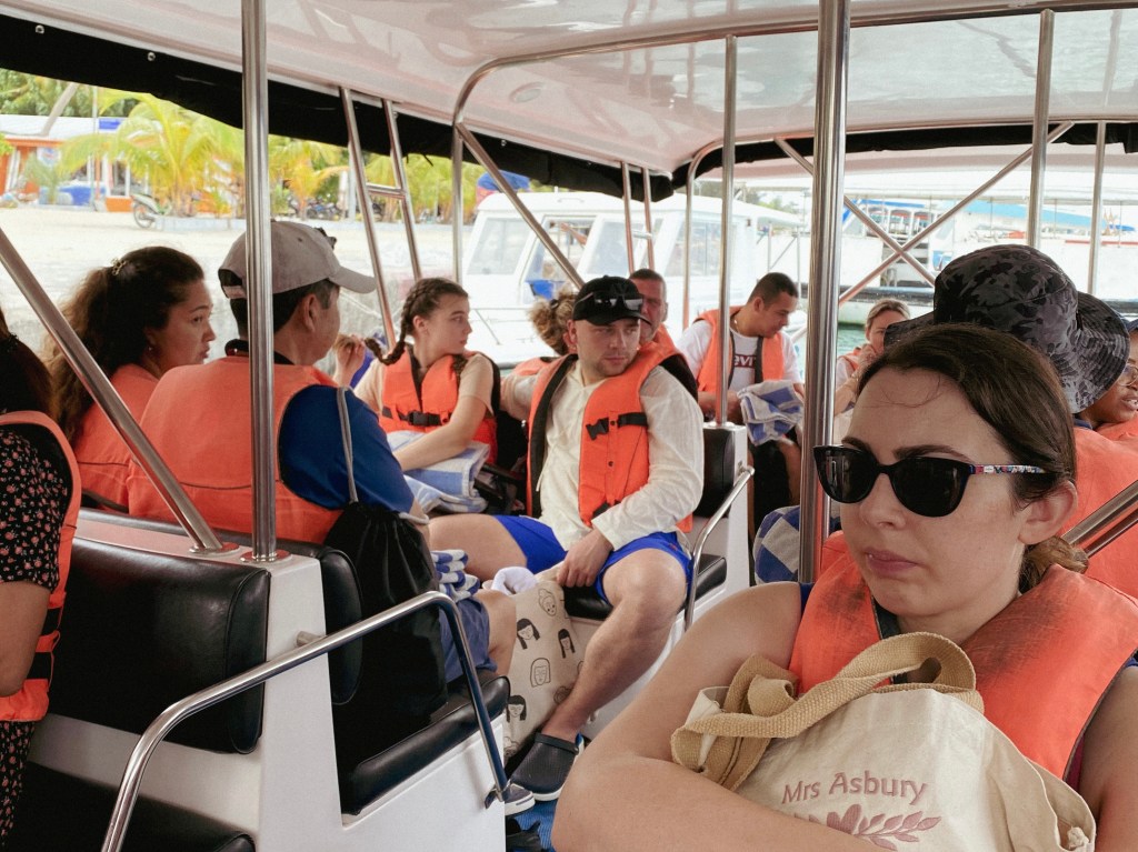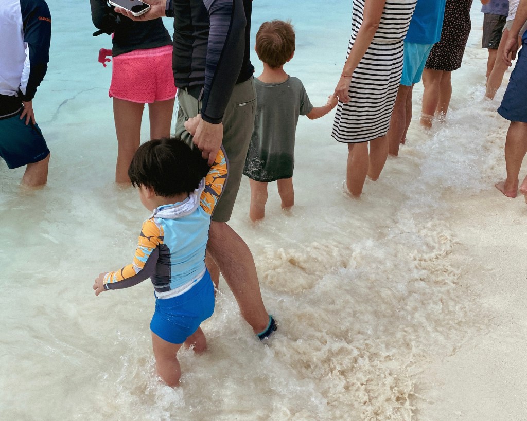 最後一站–無人沙洲午餐。中午左右,我們就會來到最後一站~一座無人沙洲進行我們的野餐。船隻抵達後,地陪就會從底艙拿出一箱一箱的食物,啊~原來就是我們的午餐啊。看到此景時其實也會有點猶豫,這午餐在沒有冷藏的環境下,伴隨了我們一整個上午…我到底要不要給小孩吃啊?但也沒辦法啊,不吃的話就會沒東西吃,所以還是給孩子吃了。嗯,雖然食物都是涼的,但其實還挺美味的!是炸雞配上醃漬過的生菜,那炸雞意外地好吃、醃菜也蠻爽口,最後我們全部吃光光唷!後續大家的腸胃也都相當健康。