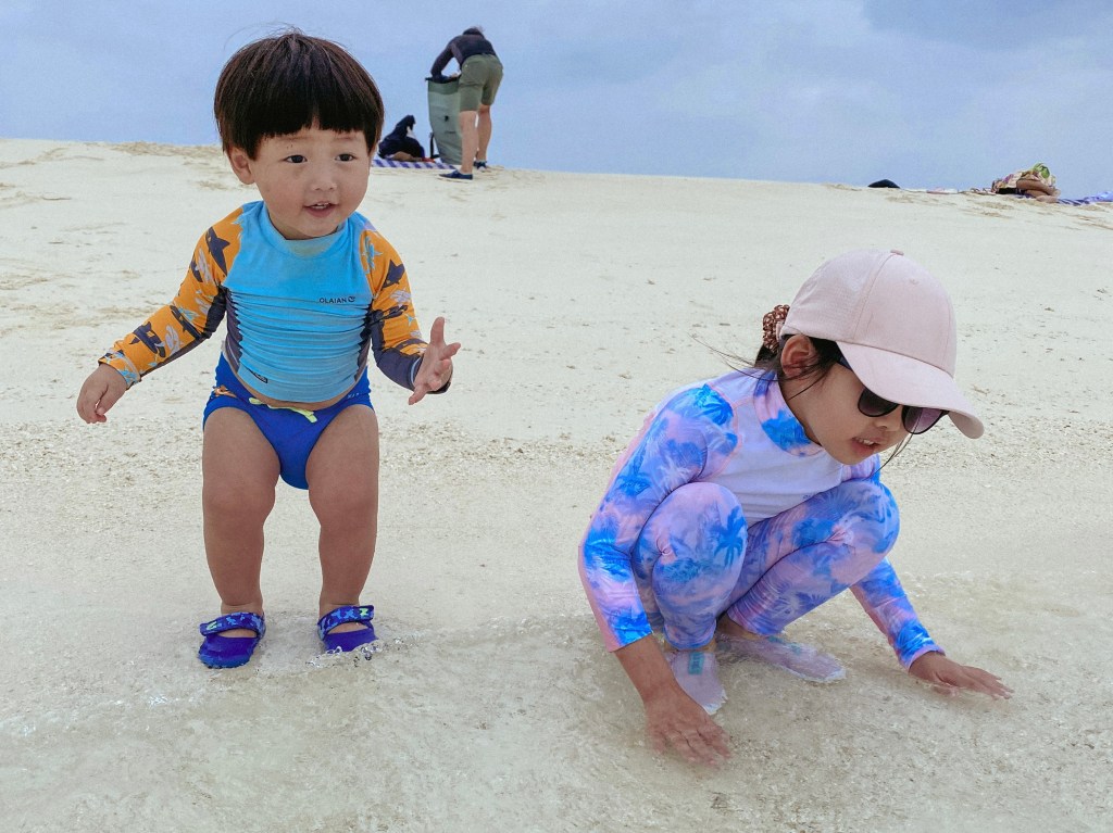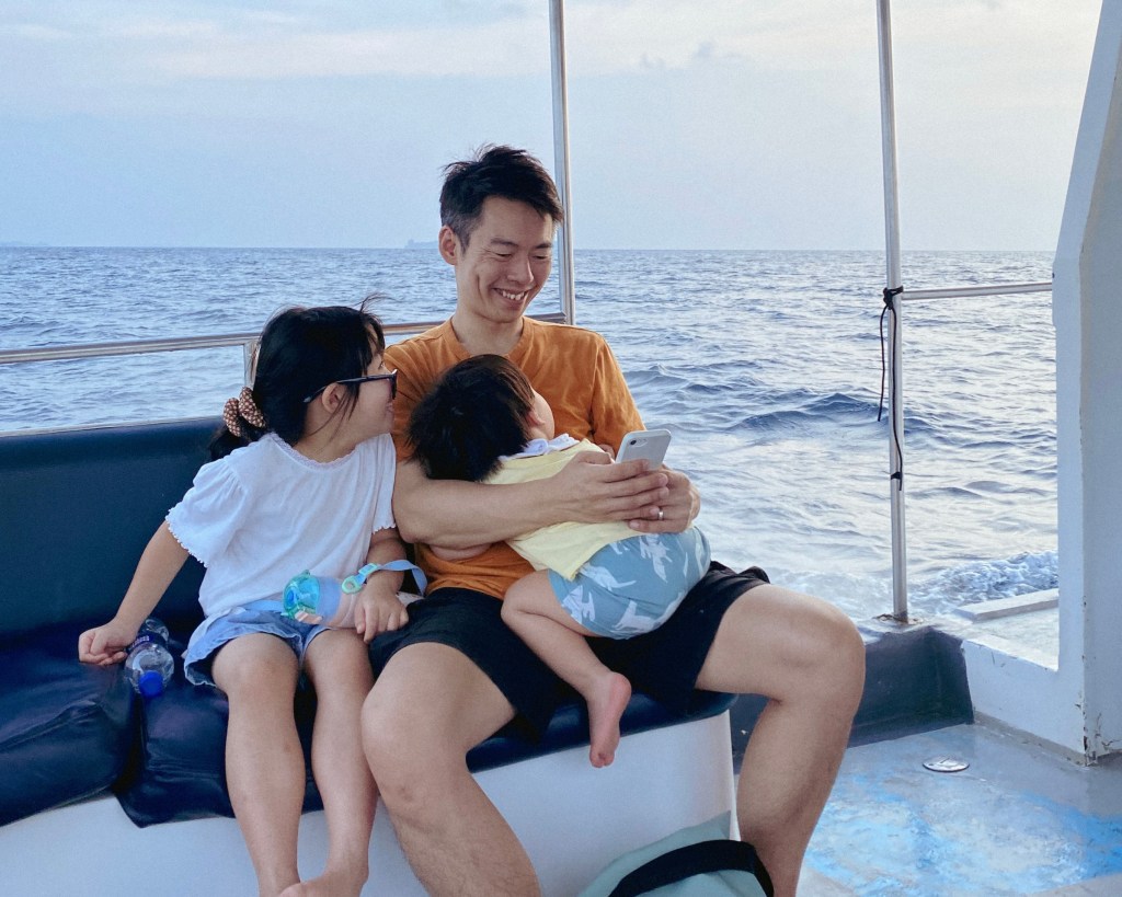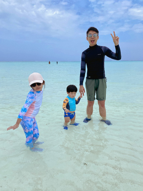 然後我們全家這趟出海行程,都是穿著長袖水母衣,都是在迪卡儂買的,除了弟弟外,其餘三人也都穿了水陸兩用玩水鞋,我們覺得方便極了。然後也有特別幫兩個小朋友準備救生衣。其實像蛋黃這樣6歲左右的孩子,旅行團是有提供適合他們穿著大小的救生衣,但像透董這樣未滿2歲的就沒有提供,所以我們有特別準備。