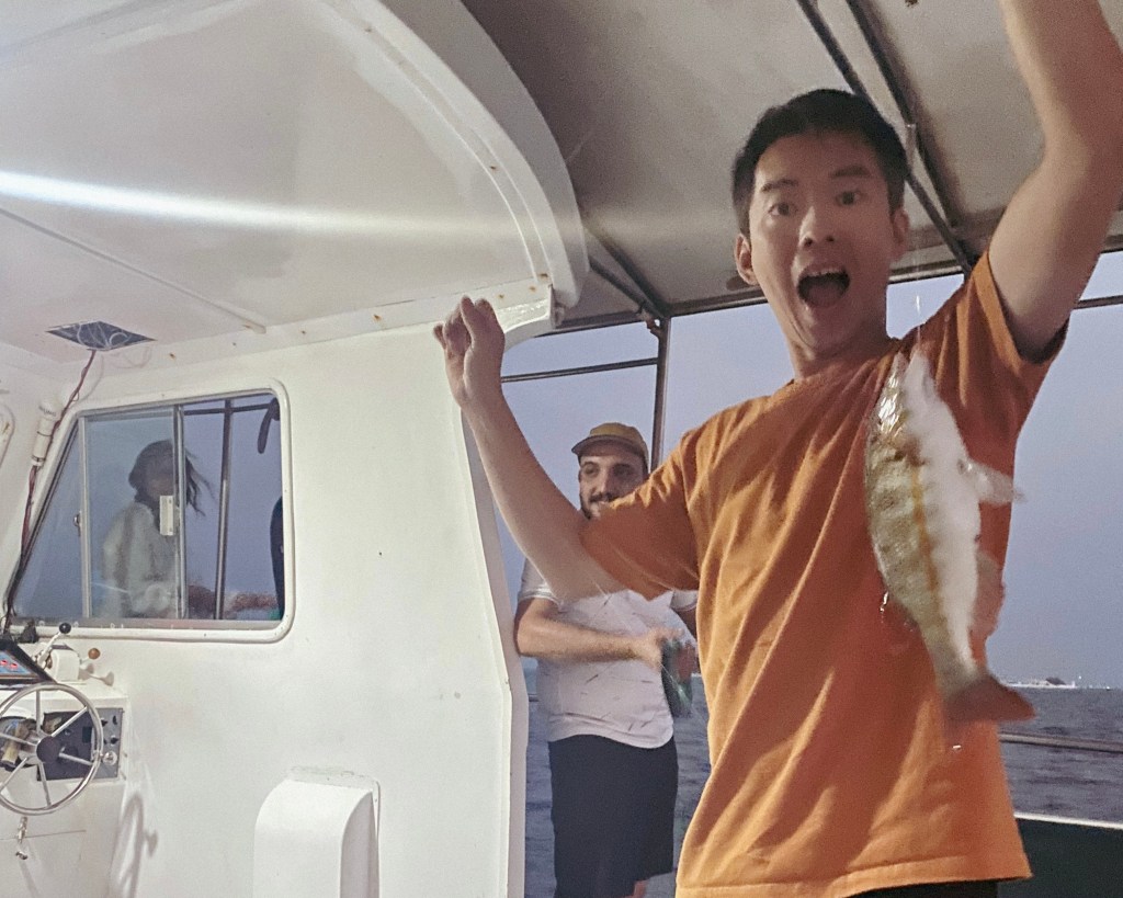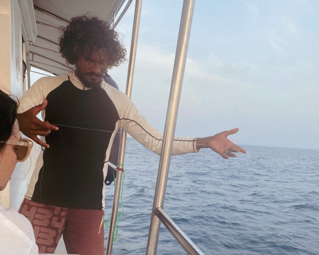 釣到魚後,地陪就會叫我們要跟漁獲拍張合照。這個時候依然不要懶散,拍就對了,因為晚餐的時候服務生會來問你有沒有拍照片?他會根據照片來挑選差不多大的那隻,所以依然是證據啊!!知道了吧,在馬爾地夫,工作人員叫你拍照就乖乖拍照,他一定有其意義的。