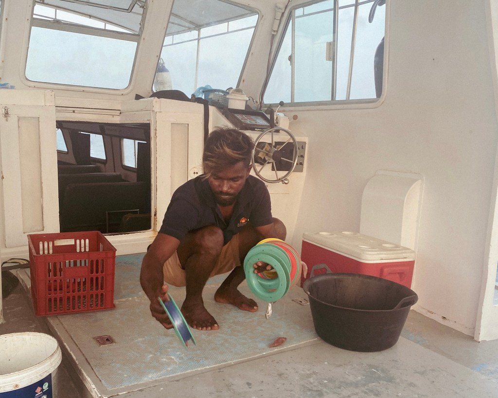 出發之後,地陪會跟大家介紹捕魚的方式。其實就蠻單純的,地陪會每人發放一組捲線,線的一頭用勾子串好魚肉作為餌,準備好就往海裡扔,感覺有動靜就拉上來。道理很簡單,但實際操作起來卻好像不是那麼一回事。我們在第一個停靠點釣了一段時間,但完全沒有任何人釣到魚,眼看大家可能就要沒有晚餐,船長就開船到下一個停靠點,在那邊終於一一等到大家都有釣到魚才開船回來。應該基本上就會讓每個人都有釣到,不然花了錢、但晚餐沒有魚吃,好像有點可憐。