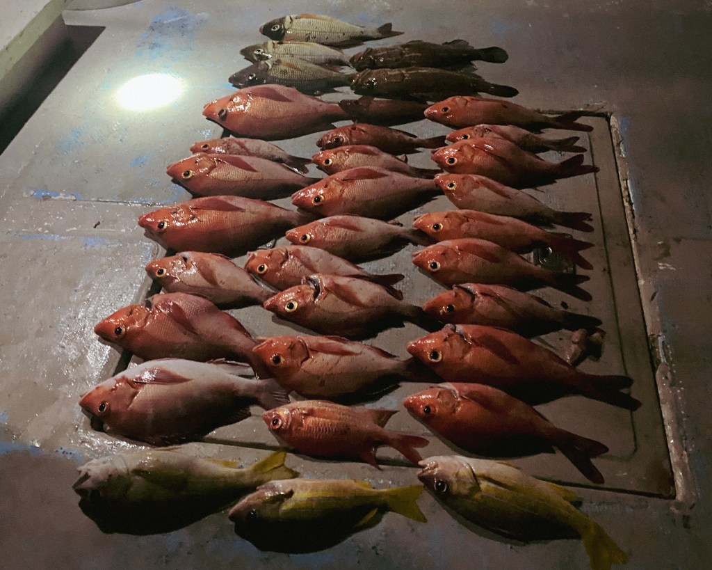 這是那晚大家一起釣的魚,活動結束後,地陪會把所有漁獲排排放、再照張相,依然是提供給飯店人員檢視。
