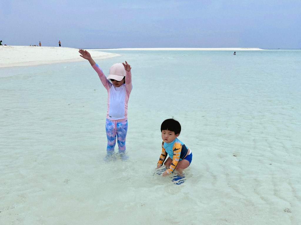 就像我上面曾提到的,其實出發前我一直在反覆猶豫到底要不要帶著小孩參加Real Break的行程,擔憂的點大概是不確定他們能不能承受較長時間的船程?安全嗎?透董萬一在船上失控暴走怎默辦?我們大人浮潛時小孩都無法參與只能待在船艙中會不會很無聊?這些考量一直盤旋在我腦海中,後來實在是覺得這都已經是第二次來馬爾地夫了,第一次沒玩到水就算、這次如果我再不去應該會後悔死。帶著赴義的心情出發,但整體來說其實還蠻OK的。可能是因為同行中還有另一位土耳其小妹妹,所以蛋黃算是蠻開心的,她也覺得白天的時候搭船很美很好玩,相當喜歡這趟旅程。透董的部分,基本上開船的時候他幾乎都在睡,雖然因為他都被抱著而可能感覺有些熱,但也都沒有太失控的情形發生,他們可以玩的時候,他也都有參與,整體還不錯。然後之所以他會吐,應該是因為老公去浮潛時,我給他看baby shark的影片導致他暈船……..