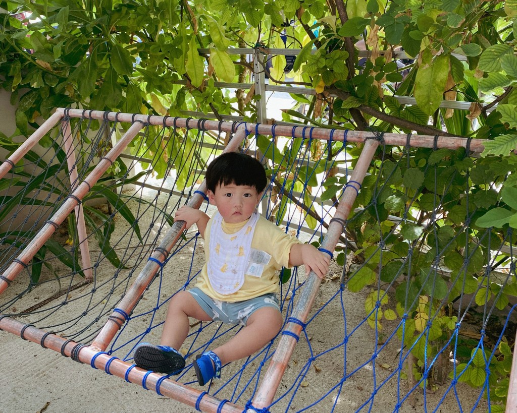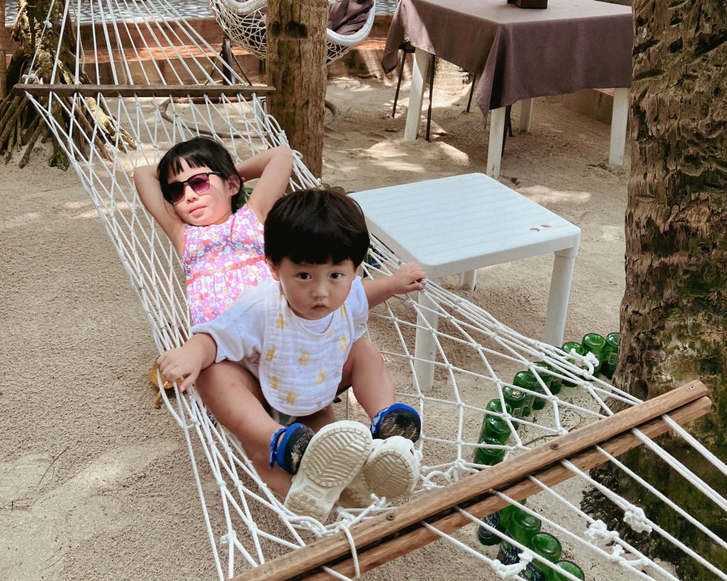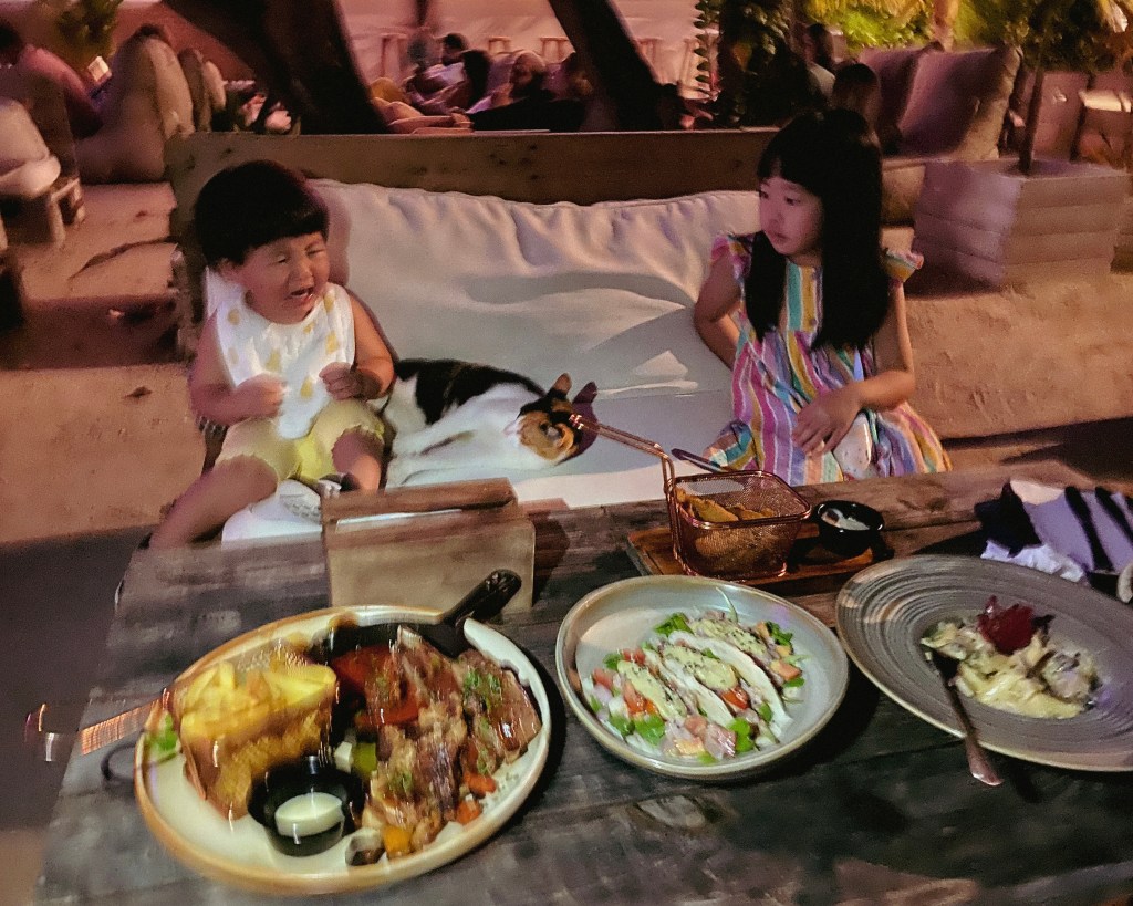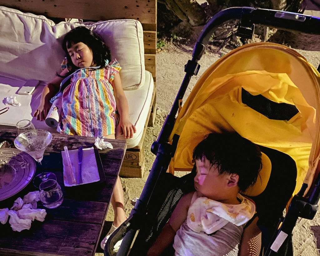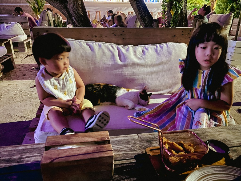 吃飽喝足後,小孩在舒服的座椅上、微風的吹拂下,聽著舒服的音樂進入了深層的睡眠。非常chill的一晚啊。這一頓吃下來約75元美金。