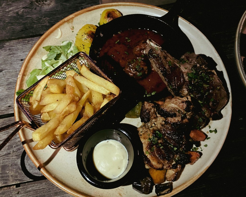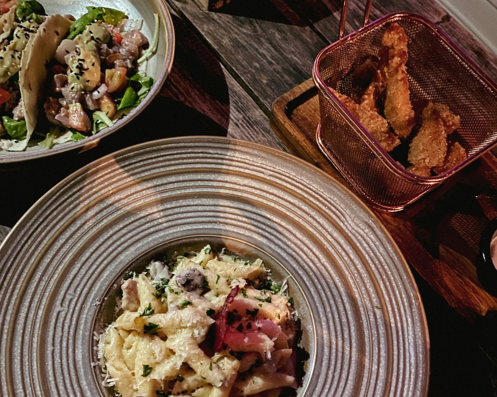我們點了炸魚柳條、白醬雞肉菌菇義大利麵、鮪魚酪梨捲餅、綜合烤肉盤,大人也點了無酒精雞尾酒、蛋黃點了草莓奶昔。唔~~我只能說,都非常美味耶!義大利麵好吃到幾乎被小孩洗劫一空;捲餅的醬料爽口美味,加上大量的酪梨與生菜,整體吃起來非常清爽!綜合烤肉盤裡有烤羊排、烤雞腿、燉煮牛肉丸、薯條以及大量的烤蔬菜,肉質軟嫩,醬料也非常入味,看似配角的烤蔬菜也因為太好吃所以被掃光。