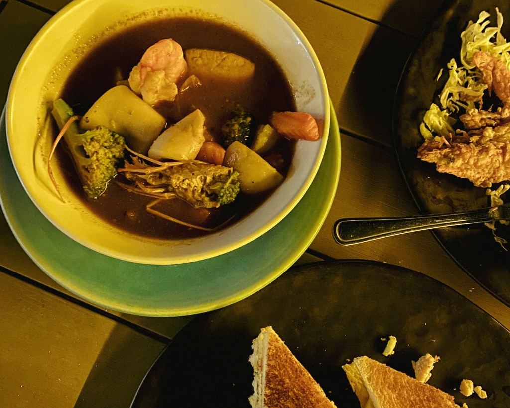 我們點了海鮮咖哩、雞肉火腿三明治、烤章魚佐蒜味檸檬奶油醬、以及炸蝦。第一名就是烤章魚那道了,濃郁又特別的醬汁配上軟Q的章魚,那個美味我們至今仍深深想念。海鮮咖哩有種湯咖哩的感覺,口感比較稀,但風味並沒有少,除了海鮮外,還有大量的蔬菜,配上白飯也還是一樣好吃,也感覺比較沒有負擔。炸蝦雖是炸物,卻無損大蝦的鮮甜美味,非常驚艷。倒是雞肉火腿三明治我自己吃了幾口沒有很喜歡,不過老公卻是吃得津津有味、最後也是完食。